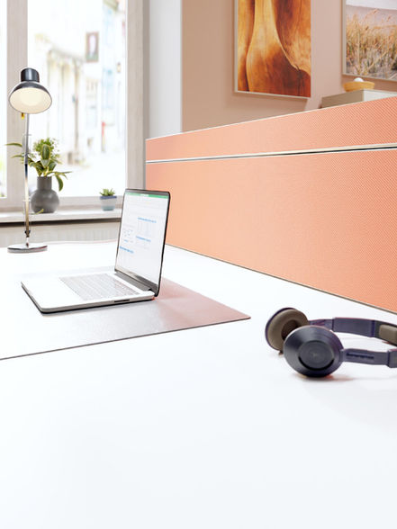 Unsere Tischaufsätze sind in unterschiedlichen Höhen und Breiten erhältlich. Auch können sie optional mit einer integrierten Funktionsschiene bestückt werden, die ein einfaches Einhängen von diversem Zubehör ermöglicht. So sorgen Sie für einen aufgeräumten Schreibtisch und haben dennoch jederzeit alles griffbereit. Jedes Tischpaneel ist mit einem akustisch wirksamen Stoff bespannt. Dieser kann aus einer Kollektion von sieben verschiedenen Stoffbezügen und über 300 unterschiedlichen Stofffarben gewählt werden kann. Das Innenleben der Paneele besteht aus Basotec, einem akustisch wirksamen Schaumstoff mit hohem Schallabsorptionsvermögen. Als attraktiver Kontrast zum Stoffbezug rundet ein umlaufender Profilrahmen aus eloxiertem Aluminium das Erscheinungsbild ab. Auch hier lässt sich die Farbe des Rahmens gemäß KLAIN-Kollektion individuell anpassen.